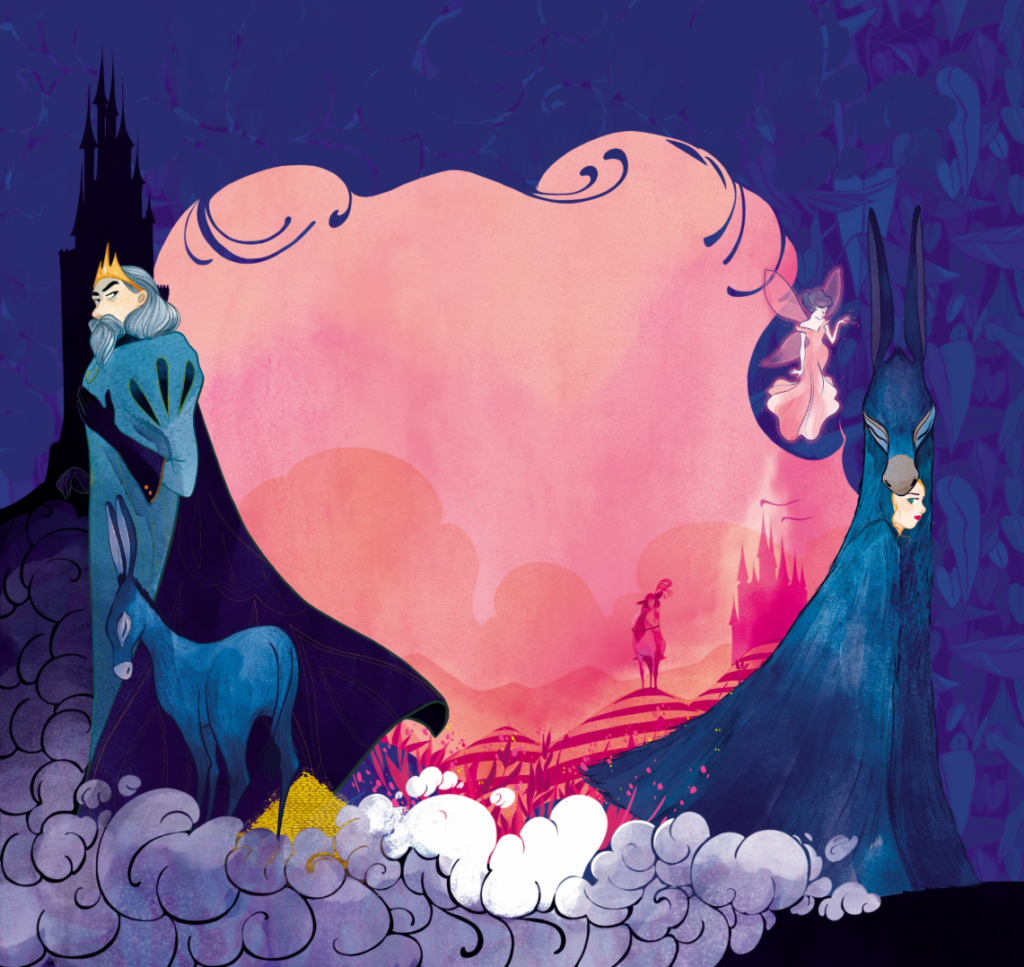 On peut distinguer un roi avec une couronne, une jeune femme enveloppée dans une grande cape, une fée qui vole et un âne. Ces personnages correspondent à ceux du conte.
