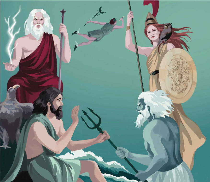 Il y a quatre personnages. Zeus tient un sceptre et lance la foudre. Poséidon brandit un trident. Hermès a des ailes aux pieds. Ulysse, lui, n'a pas d'arme divine.