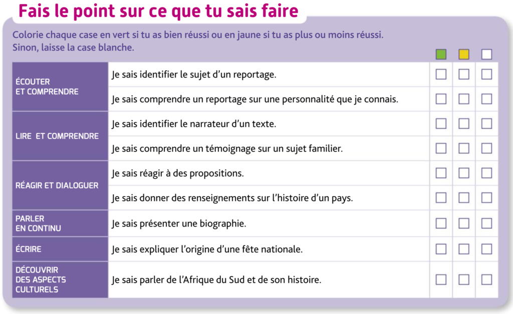 Prends ta copie du tableau d’auto-évaluation et colle-la dans ton cahier d’anglais.