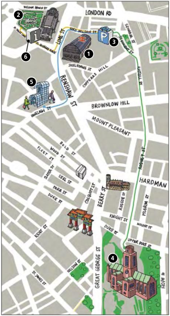 b. Look at the map of Liverpool and say what number corresponds to each place.