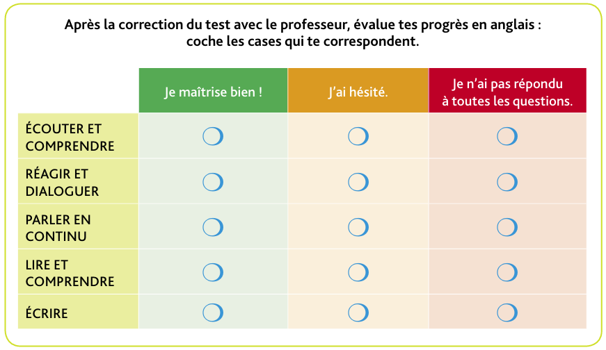 Après la correction de test avec le professeur, évalue tes progrès en anglais : coche les cases qui te correspondent.