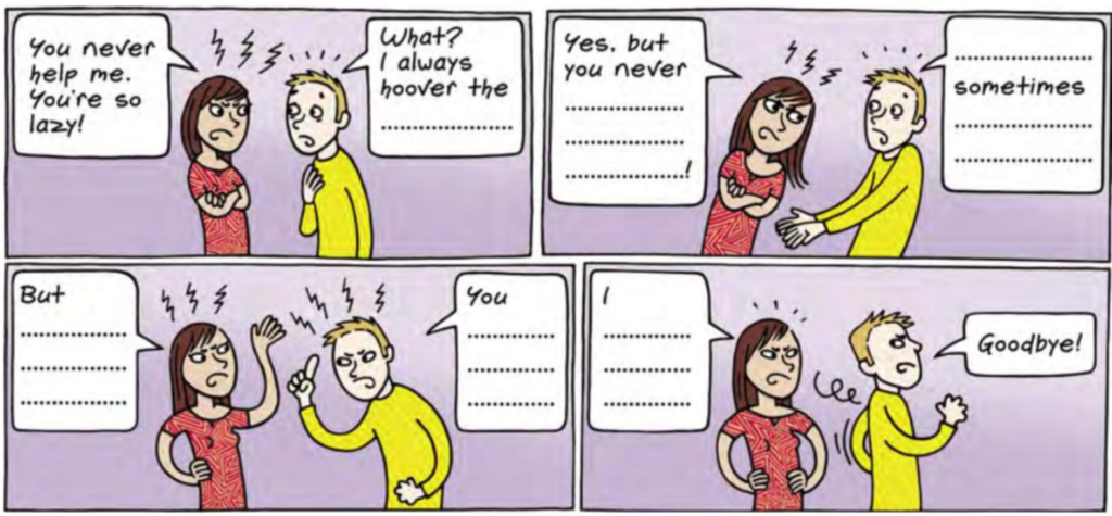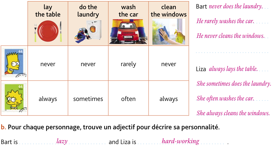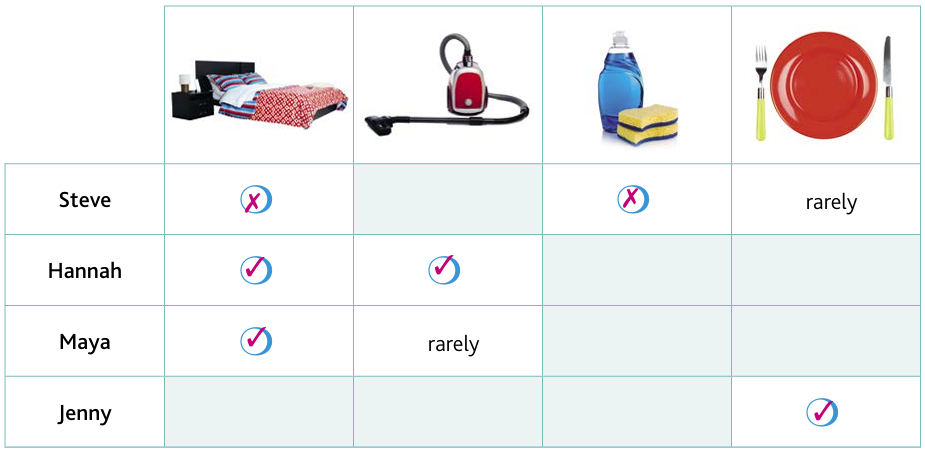 - Create the dialogue of the comic strip. The two characters express reproaches about doing or not doing the housework. Use the expressions you know (hoover the floor, make your bed, tidy your room, lay the table, do the washing up) and the adverbs of frequency.